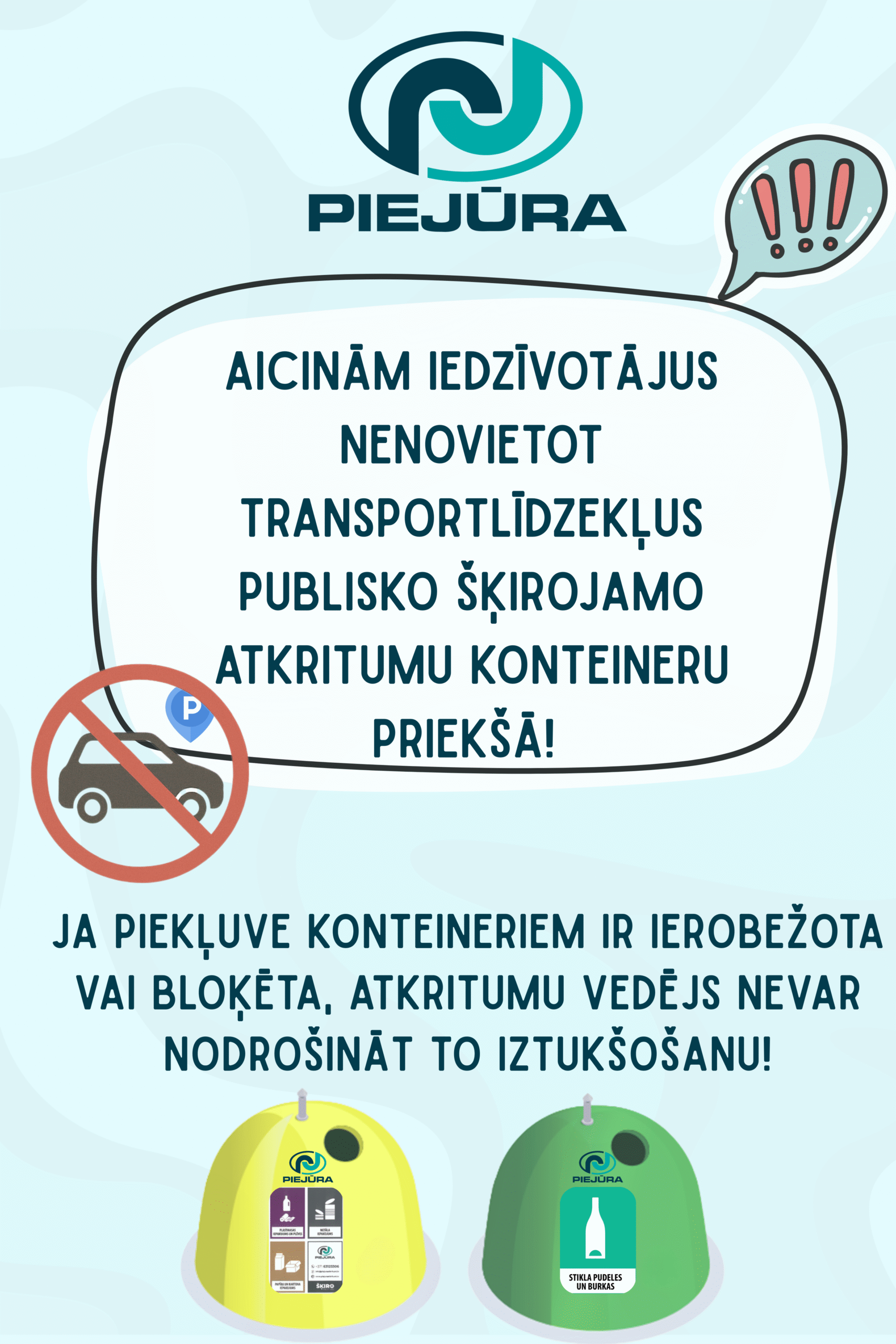 Aicinām iedzīvotājus nenovietot transportlīdzekļus publisko šķirojamo atkritumu konteineru priekšā.