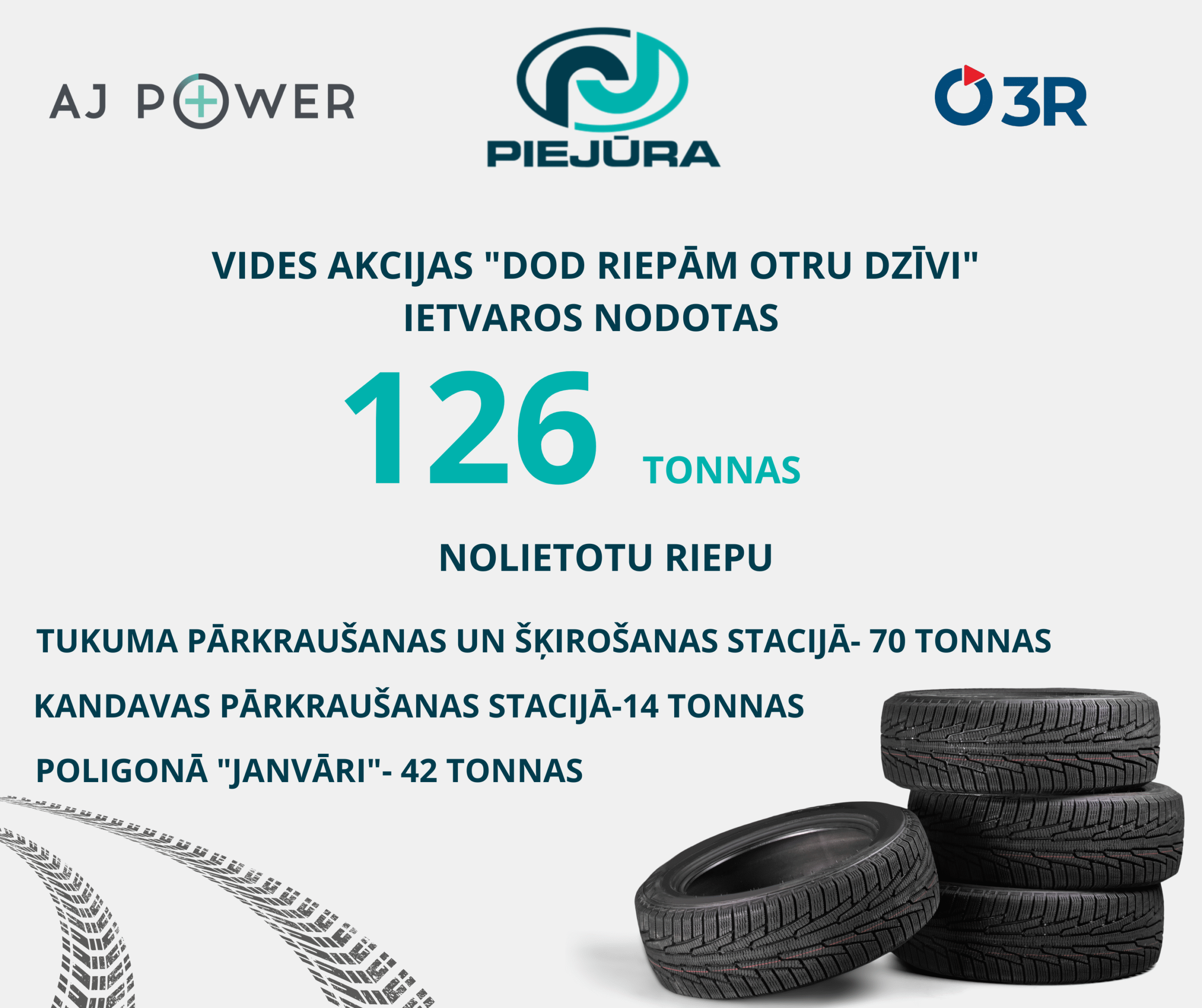 SIA “Atkritumu apsaimniekošanas sabiedrība “Piejūra” sadarbībā ar AJ Power un SIA “3R” novembrī rīkoja vides akciju “Dod riepām otru dzīvi”, kuras laikā iedzīvotājiem bija iespēja bez maksas nodot nolietotās vieglo automašīnu riepas. Akcijas periodā nodotas 126 tonnas nolietotu riepu. 🛞