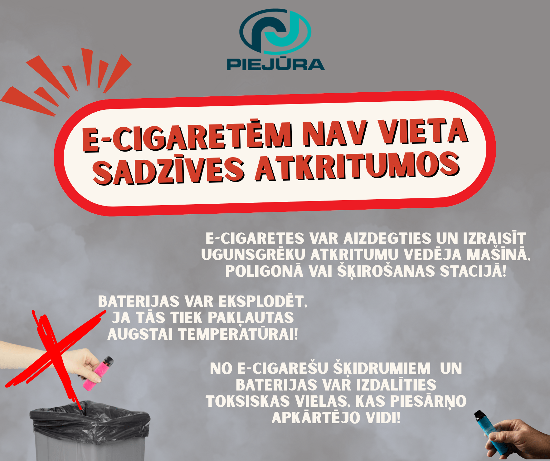 Vai zināji, ka izlietota e-cigarete, iemesta sadzīves atkritumu konteinerā, var kļūt par īstu “laika bumbu”? 💣